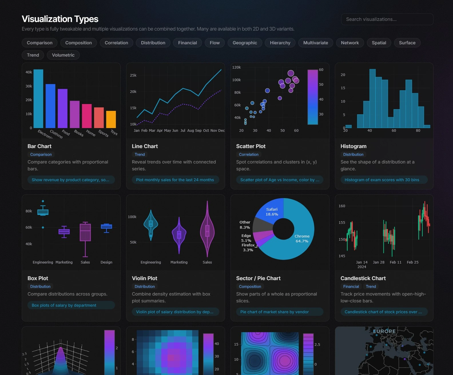 Bar charts, scatter plots, histograms, heatmaps, 3D surfaces, geographic maps, force-directed networks, Sankey flows, treemaps, parallel coordinates, and more.
